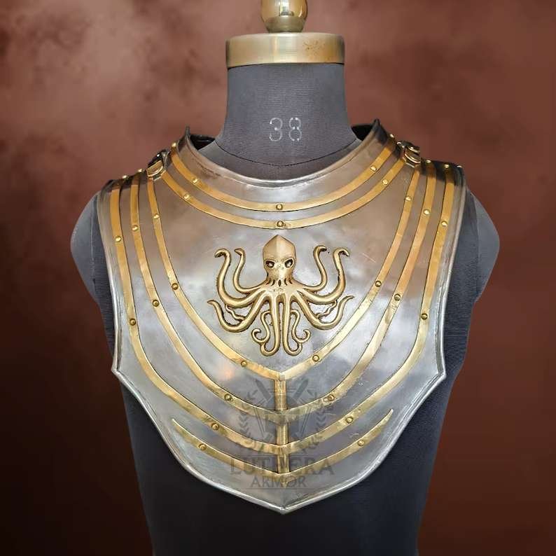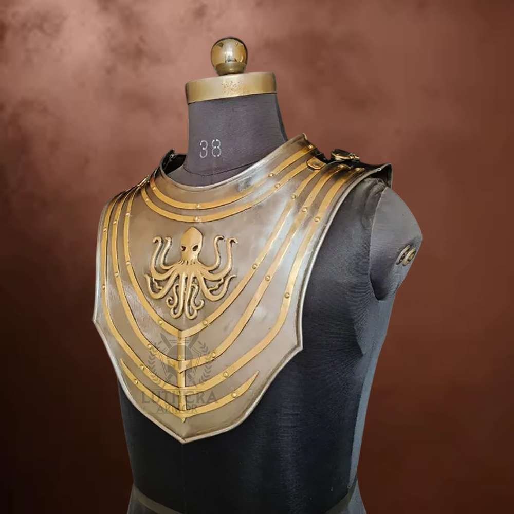 Protect your neck in style with this Medieval Octopus Gorget, handcrafted from heavy 18-gauge steel for strength, durability, and an eye-catching fantasy design.