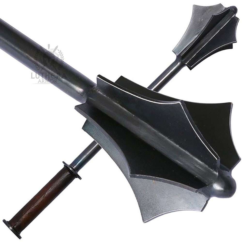 This excellent German Mace has 5 flanges and is made from hollow steel shaft with a blackened finish to mimic the color of the original. The bottom of the shaft is wrapped in leather for an improved grip. Optional wrist loop available.